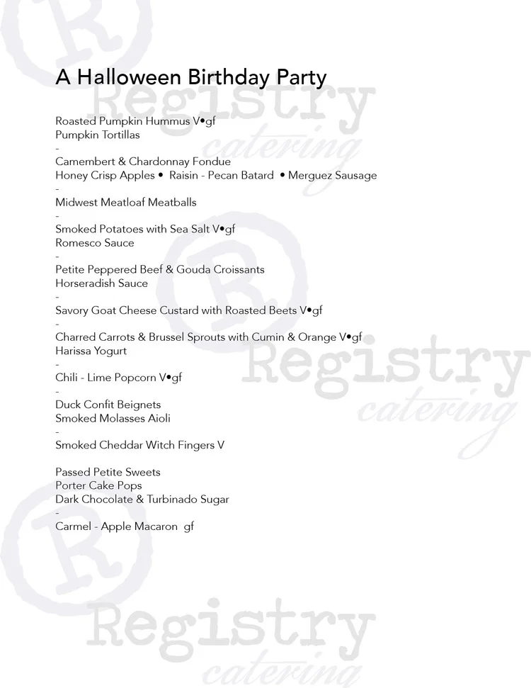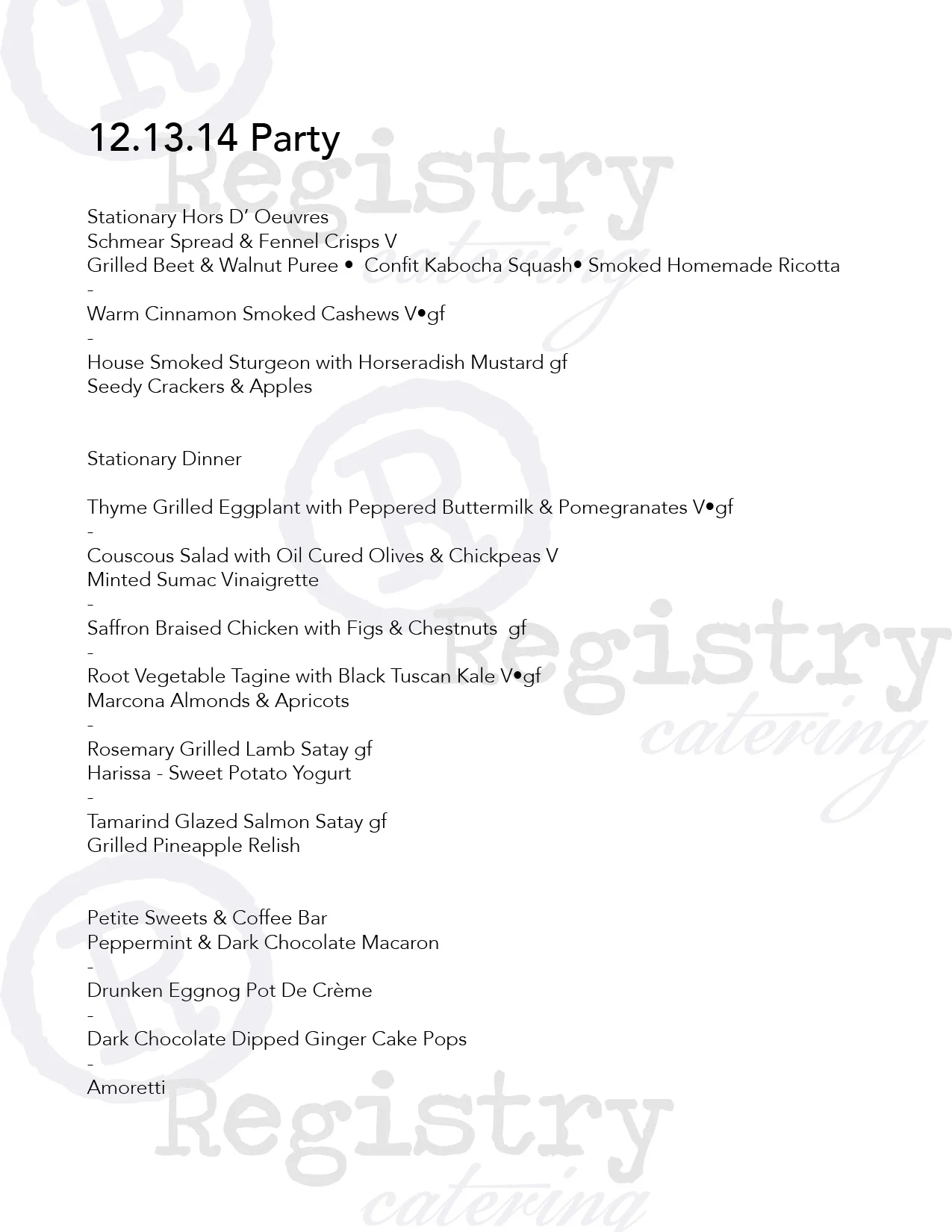 Registry is a full service catering company. Along with being inspired by and featuring seasonal bounty, Chef Erika will create a custom menu that fits your personal taste and vision. We offer many different types of service. A couple of our most unique styles of dinner service are strolling dinners and family style service. Below are more details and menus that highlight both of these service styles. These menus will give you an idea of our cuisine, but keep in mind your menu will be created specifically for you.